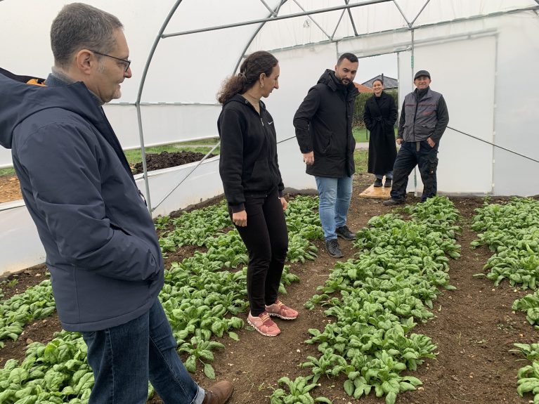 Vjollca Mustafa (Mitte) zeigt ihr Gewächshaus. Links im Bild: Daniel Seller, Programmdirektor von CARE Österreich. Foto: CARE